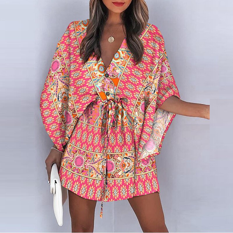 Vestito corto bohémien chic con stampa etnica con maniche a pipistrello e cintura regolabile